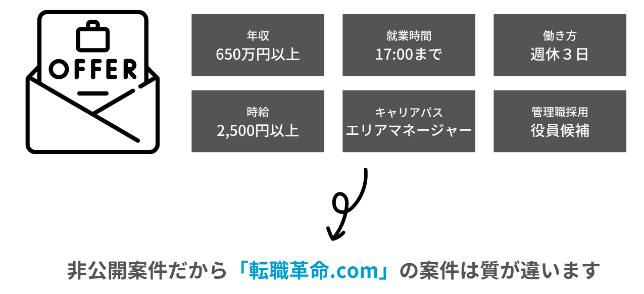 転職は、人生において非常に大きな決断です。その決断に我々を選んでいただく以上、我々もお寄せいただく『期待以上』の価値を提供したいと考えております。その想いから、2016年の創業以来、お一人おひとりを確実に支援できる範囲に絞って非公開求人のみを扱いご支援を続けて参りました。生活が豊かになるご支援が出来ると考えておりますので是非ご期待ください。